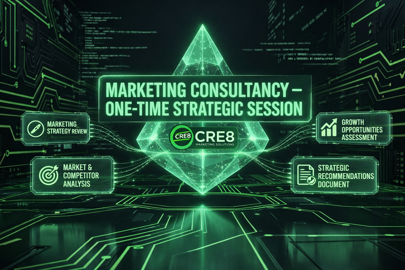 This product represents a one-time professional marketing consultancy service provided by CRE8. The service includes a comprehensive strategic consultation focused on evaluating the client’s current marketing position, identifying gaps, and recommending actionable improvements.